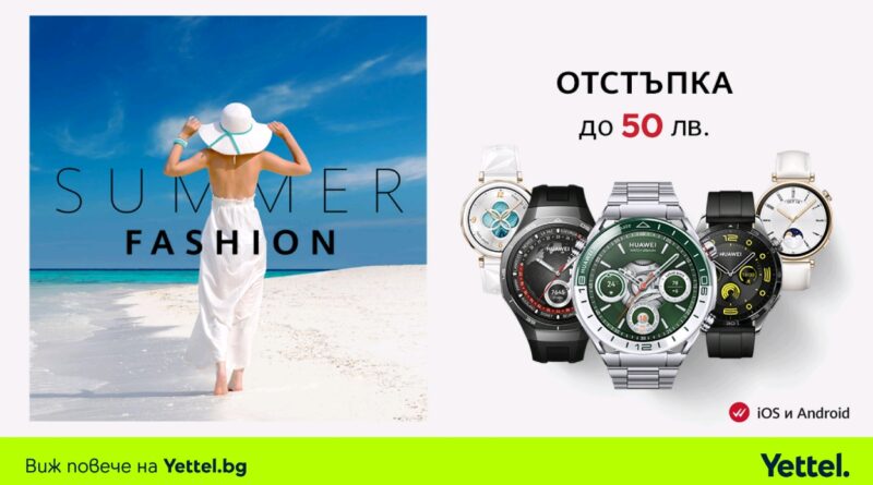 До края на месец юни Yettel предлага специална лятна селекция от смартчасовници HUAWEI, които комбинират елегантност, здравни функции от ново поколение и издръжлива батерия. Някои от устройствата могат да бъдат закупени с отстъпка до 50 лв. – в брой или на лизинг, в цялата магазинна мрежа на оператора. А за всички онлайн поръчки е включена безплатна доставка.